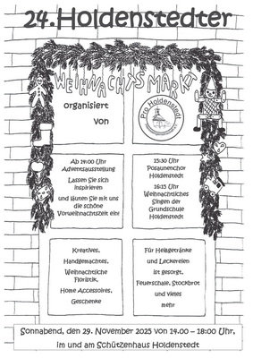 Pro Holdenstedt bedankt sich bei allen Ausstellern, dem Posaunenchor Holdenstedt sowie der Grundschule Holdenstedt und macht schon mal darauf aufmerksam, dass der 24. Weihnachtsmarkt am 29.11.2025 am Schützenhaus Holdenstedt stattfinden wird und wünscht allen eine besinnliche Weihnachtszeit.