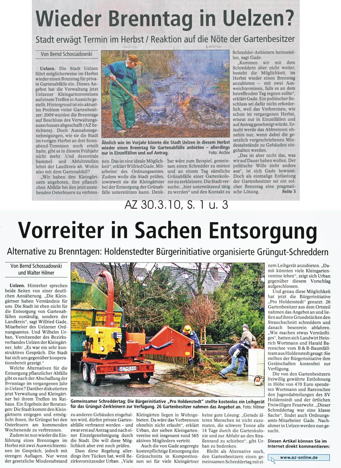 In Holdenstedt machte man sich innerhalb der dort in vielerlei Hinsicht rührigen Bürgerinitiative seine Gedanken und bot den örtlichen Bürgern erstmals einen Schreddertag an. Jugendliche der Feuerwehr und des Sportvereins verteilten Flyer mit entsprechenden Informationen zu diesem Vorhaben und der Erfolg blieb nicht aus.