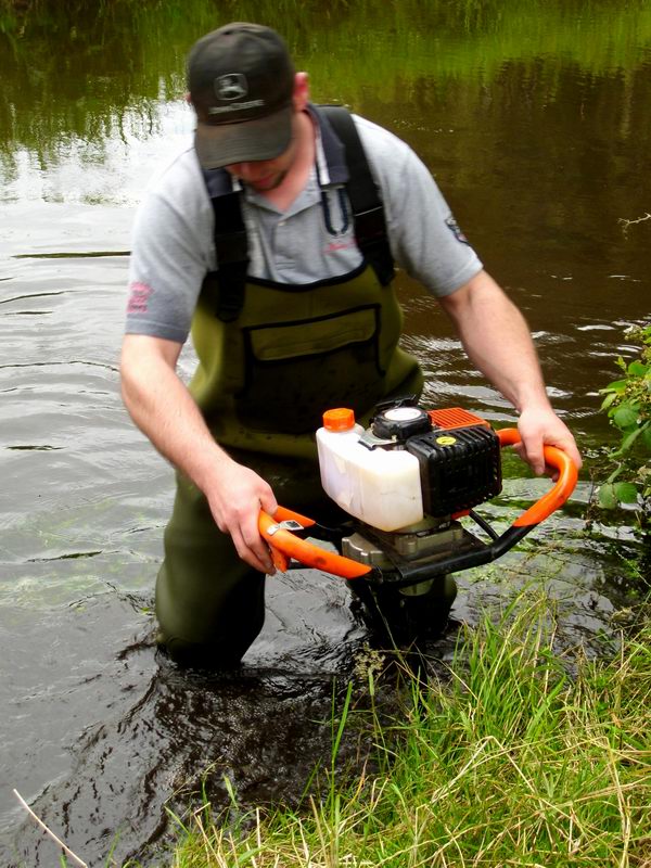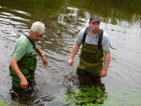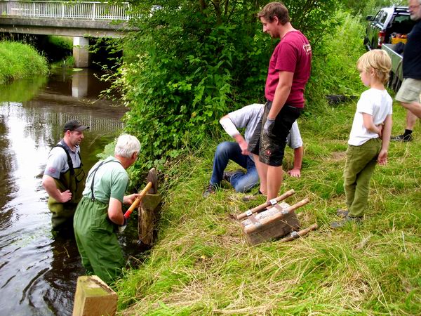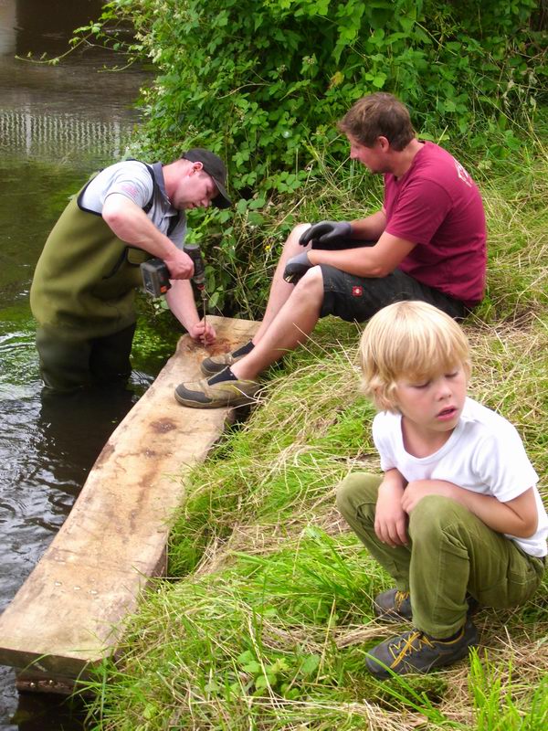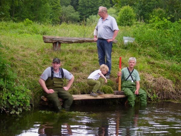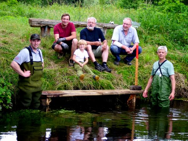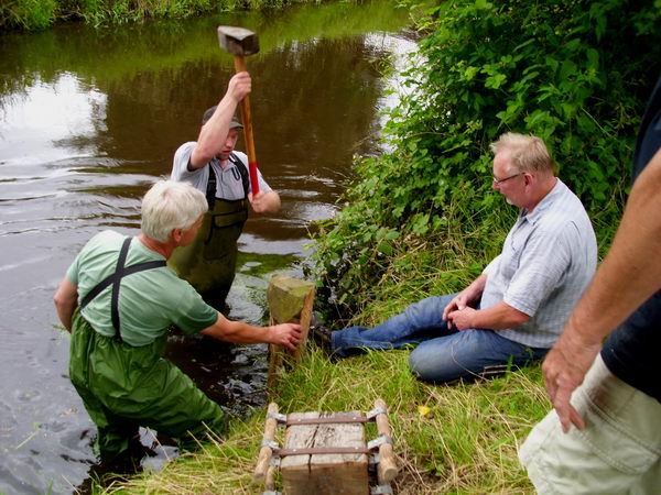 Mitglieder von Pro Holdenstedt, die in unmittelbarer Nähe vorher bereits eine Ruhebank errichtet hatten, rammten, mit Waathosen ausgestattet, neue Eichenpfähle in den Grund und befestigten darauf eine angerauhte Bohle, sodass künftig wieder gefahrlose Nutzungen erfolgen können.