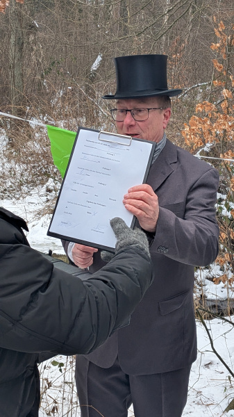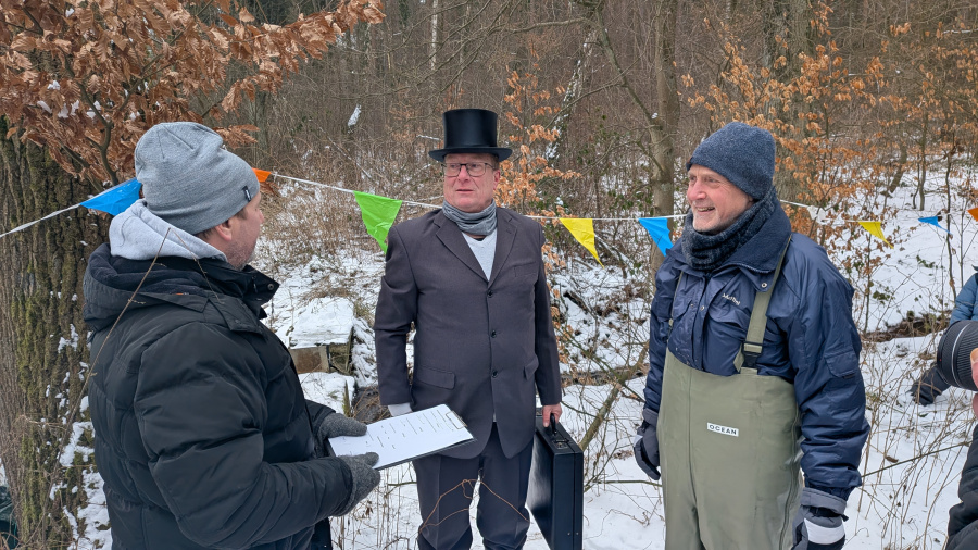 Am 2. Februar war es so weit. Der erfahrene Notar Burmeister vereidigte Benjamin Zasendorf zu seinem Teichassistenten. Die verschiedenen Tests überzeugten den Notar jedoch nicht, so dass der sich schließlich höchst persönlich per Barfußtest vom überlaufenden Teich überzeugte. Zu diesem launigen Spektakel waren rund einhundert Holdenstedter gekommen. Anschließend wurden die 13 Preise im Gesamtwert von mehr als dreihundert Euro unter den Wettteilnehmern auf dem Holdenstedter Sportplatz verlost. Bei Bratwurst, sowie Kalt- und Warmgetränken wurde noch intensiv über die vermutete Sabotage am Wasserstand gefachsimpelt. Alles in allem eine schöne Veranstaltung. Pro Holdenstedt bedankt sich bei den Akteuren und Gästen und ganz besonders bei Butz für die Organisation!